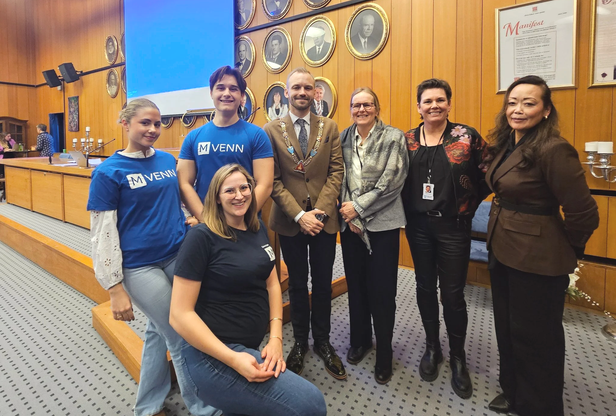 Fra venstre: Andjela Zarubica, tidligere M-venn i Generasjon M, M-venn Irnes Sumbuljevic, ordfører Adrian Tollefsen, kommunalsjef for helse og velferd Kari Hesselberg, innovasjonsrådgiver Hilde Birkeland og kommunedirektør Susanne Vist. Bildet er tatt Andjela og Irnes presenterte Generasjon M og erfaringene fra jobben som M-venn i et kommunestyremøte i Øvre Eiker kommune. Foran: regionleder i Generasjon M, Thea Giske.